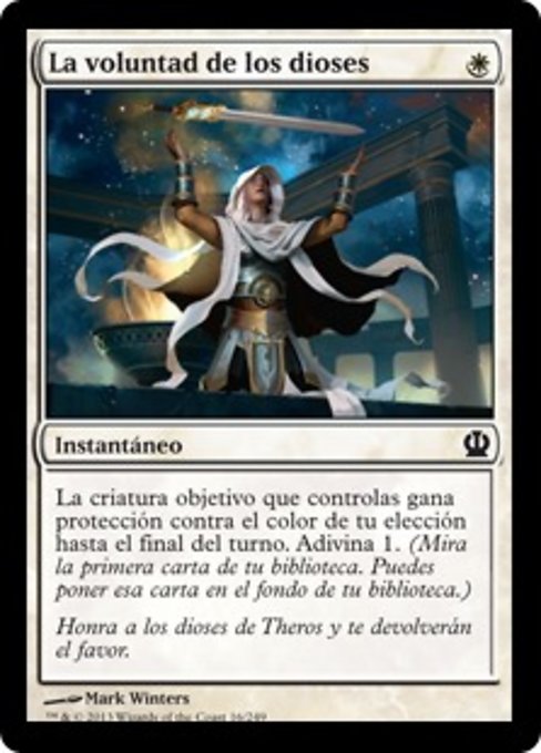 |  Variations— Parts— | La voluntad de los diosesLa criatura objetivo que controlas gana protección contra el color de tu elección hasta el final del turno. (No puede ser bloqueada, hecha objetivo, recibir daño, estar encantada o ser equipada por nada de ese color.) Adivina 1. (Mira la primera carta de tu biblioteca. Puedes poner esa carta en el fondo de tu biblioteca.)