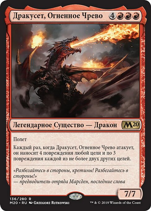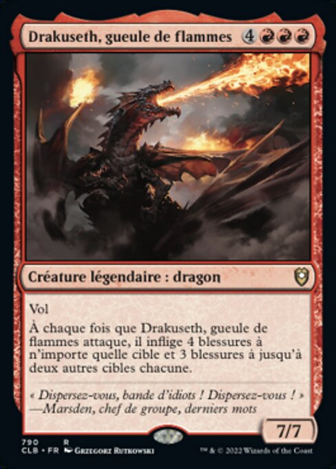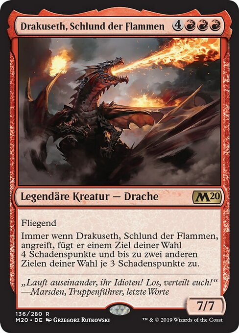 |  Variations— Parts— | Drakuseth, gueule de flammes7 / 7 Vol À chaque fois que Drakuseth, gueule de flammes attaque, il inflige 4 blessures à n'importe quelle cible et 3 blessures chacune à jusqu'à deux autres cibles.