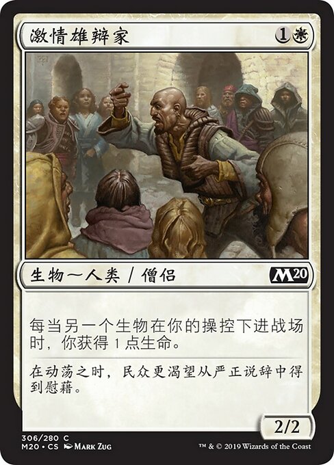 |  Variations— Parts— | Orateur passionné2 / 2 À chaque fois qu'une autre créature arrive sur le champ de bataille sous votre contrôle, vous gagnez 1 point de vie.