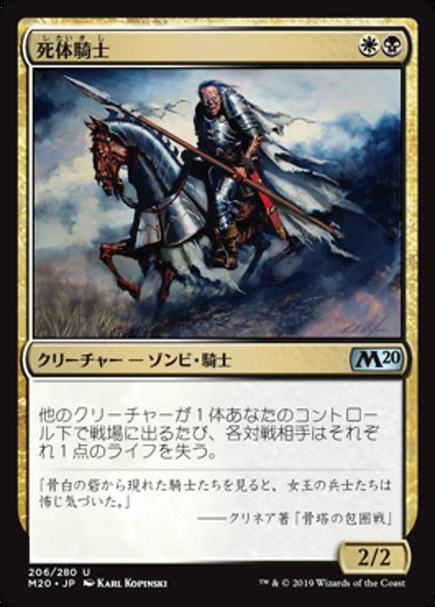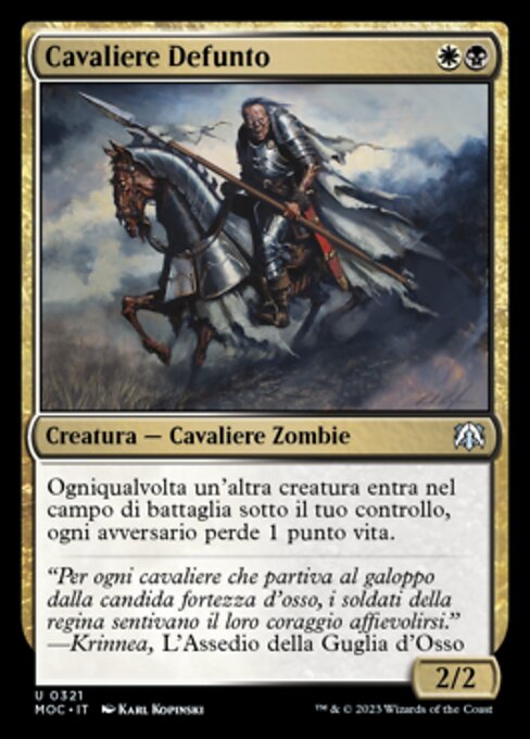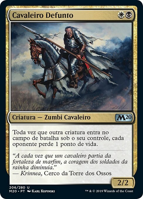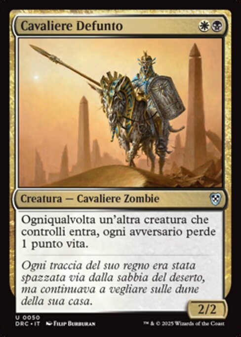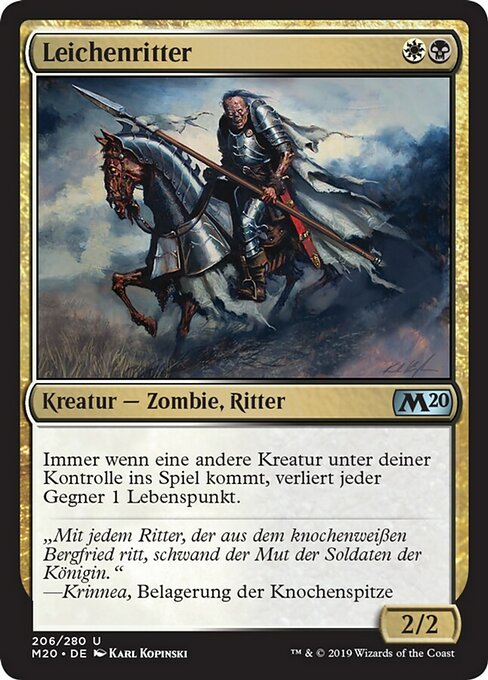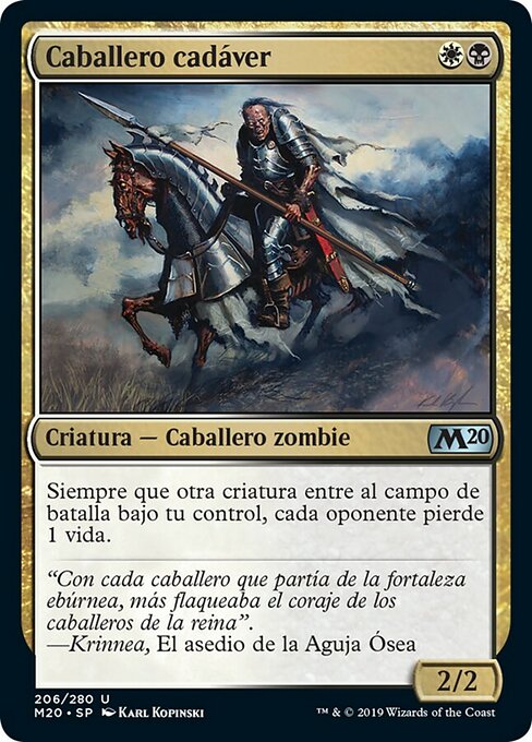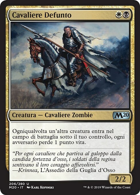 ![]() Variations— Parts— | Cavaliere Defunto2 / 2 Ogniqualvolta un'altra creatura entra nel campo di battaglia sotto il tuo controllo, ogni avversario perde 1 punto vita.