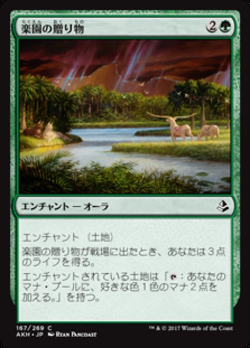 ![]() Variations— Parts— | 楽園の贈り物エンチャント(土地) 楽園の贈り物が戦場に出たとき、あなたは3点のライフを得る。 エンチャントしている土地は「