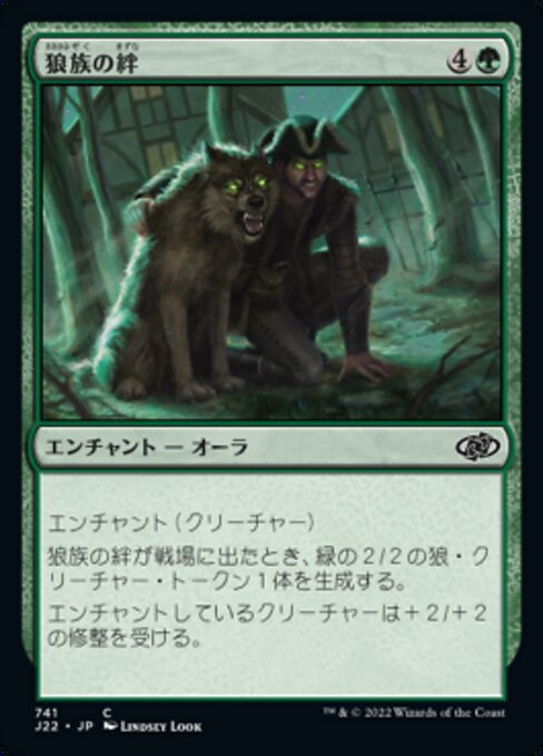 ![]() Variations— Parts— | 狼族の絆エンチャント(クリーチャー) 狼族の絆が戦場に出たとき、緑の2/2の狼・クリーチャー・トークンを1体生成する。 エンチャントしているクリーチャーは+2/+2の修整を受ける。