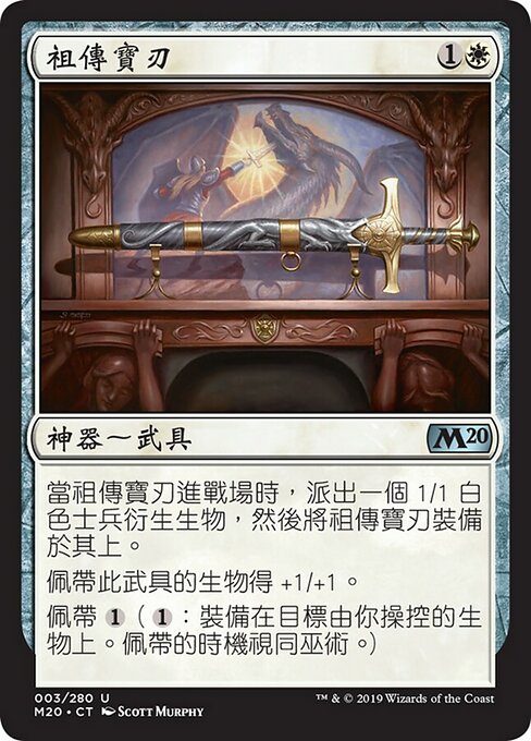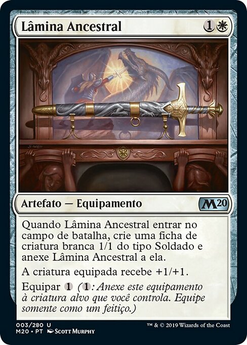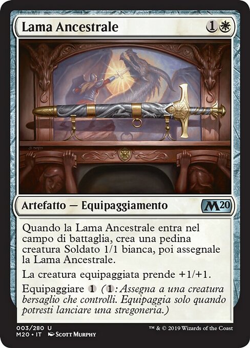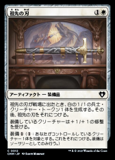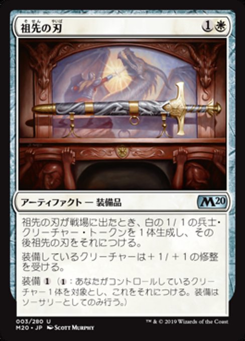 |  Variations— Parts— | 祖先の刃祖先の刃が戦場に出たとき、白の1/1の兵士・クリーチャー・トークンを1体生成し、その後祖先の刃をそれにつける。 装備しているクリーチャーは+1/+1の修整を受ける。 装備