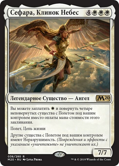 ![]() Variations— Parts— | 天空の刃、セファラ7 / 7 あなたは、この呪文のマナ・コストを支払うのではなく、 飛行、絆魂 他の、あなたがコントロールしていて飛行を持つクリーチャーは破壊不能を持つ。(ダメージや「破壊する」と書かれた効果では、それらは破壊されない。)