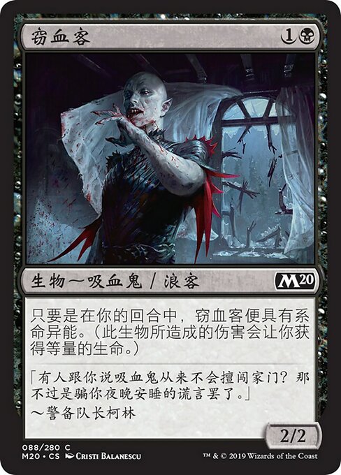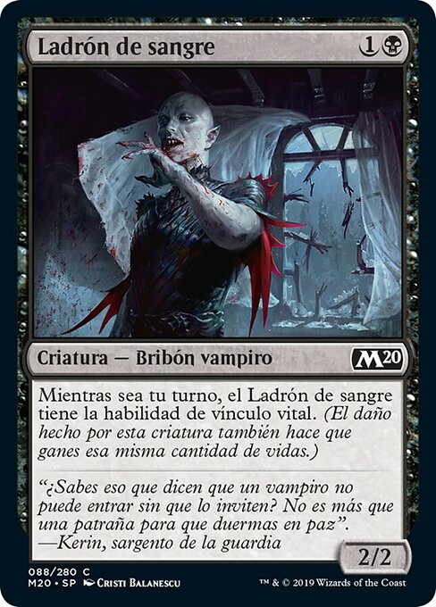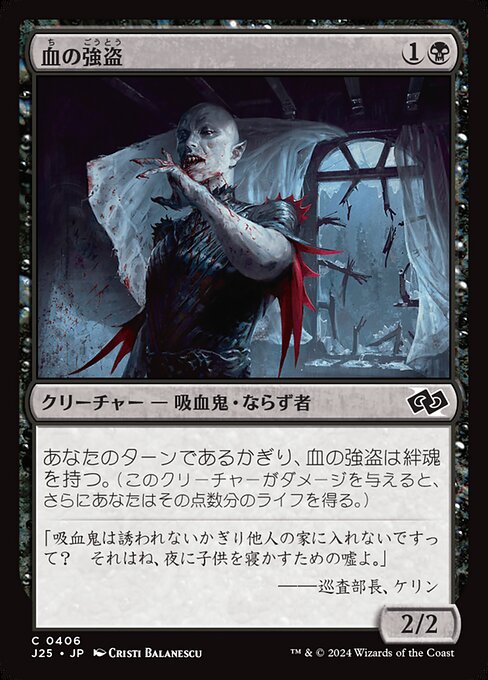 ![]() Variations— Parts— | 血の強盗2 / 2 あなたのターンであるかぎり、血の強盗は絆魂を持つ。(このクリーチャーがダメージを与えると、さらにあなたはその点数分のライフを得る。)