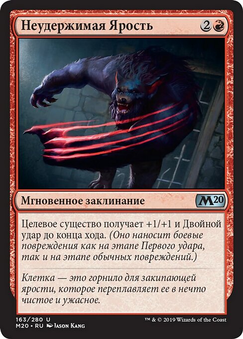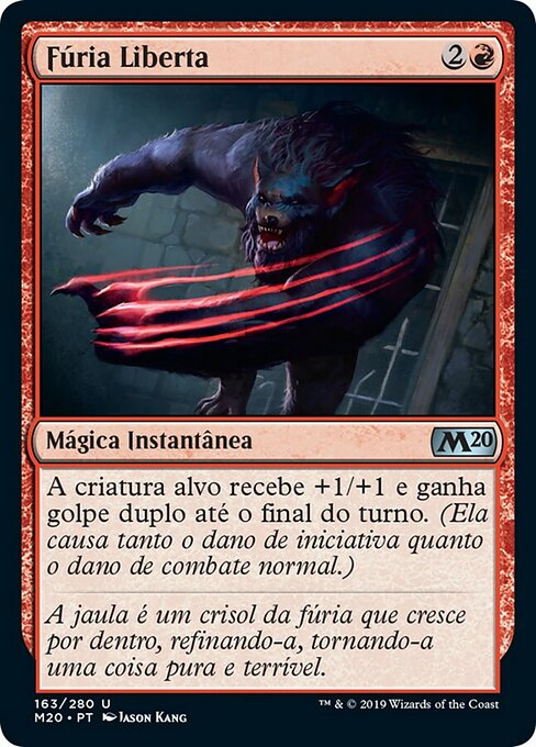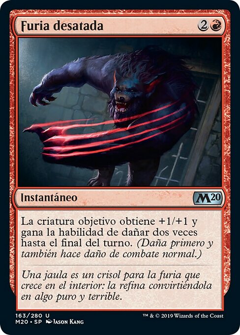 |  Variations— Parts— | 가둘 수 없는 격노생물을 목표로 정한다. 그 생물은 턴종료까지 +1/+1을 받고 이단공격을 얻는다. (이 생물은 선제공격 전투피해와 일반 전투피해를 둘 다 입힌다.)