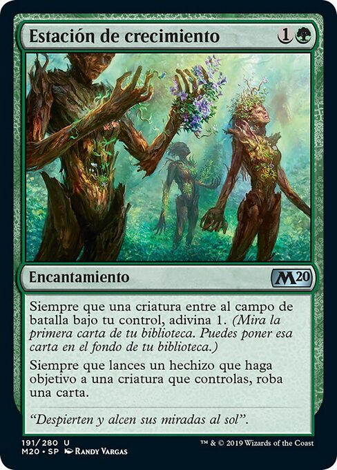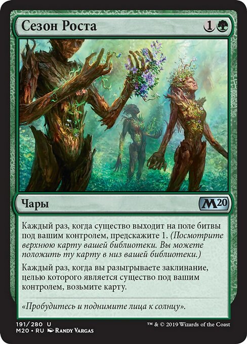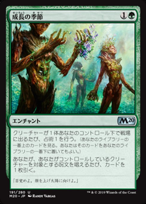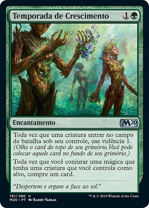 ![]() Variations— Parts— | Temporada de CrescimentoToda vez que uma criatura entrar no campo de batalha sob seu controle, use vidência 1. (Olhe o card do topo de seu grimório. Você pode colocar aquele card no fundo de seu grimório.) Toda vez que você conjurar uma mágica que tenha uma criatura que você controla como alvo, compre um card.