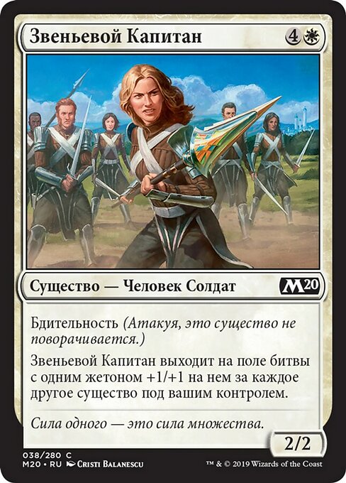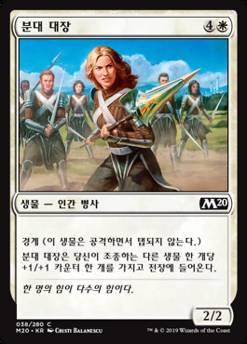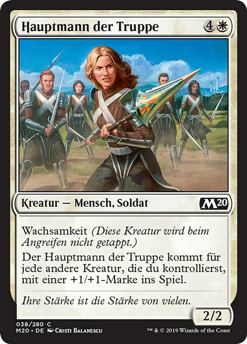 |  Variations— Parts— | 小隊隊長2 / 2 警戒(此生物攻擊時不需橫置。) 小隊隊長進戰場時上面有數個+1/+1指示物,其數量為由你操控之其他生物的數量。