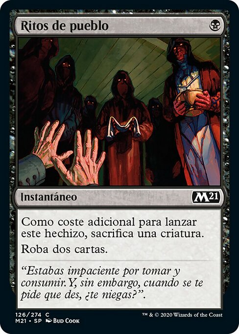 ![]() Variations— Parts— | Village RitesAs an additional cost to cast this spell, sacrifice a creature. Draw two cards.