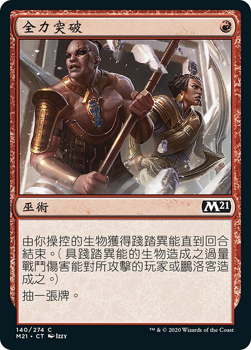 |  Variations— Parts— | Crash ThroughCreatures you control gain trample until end of turn. (Each of those creature can deal excess combat damage to the player or planeswalker it's attacking.) Draw a card.