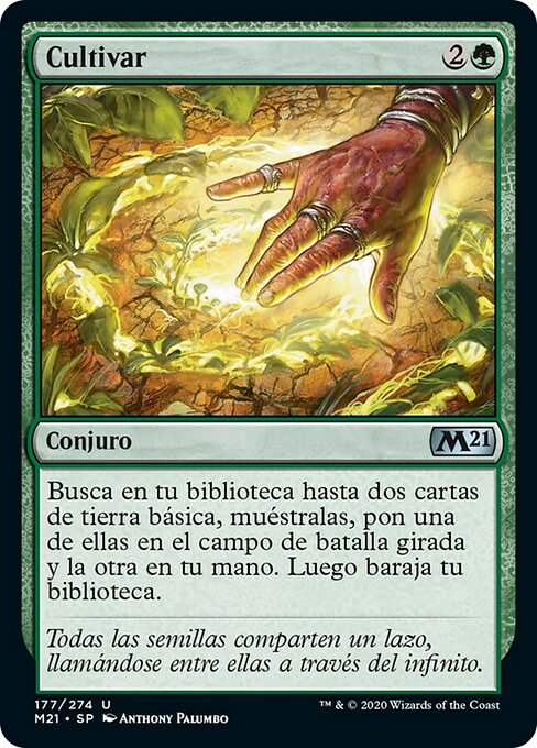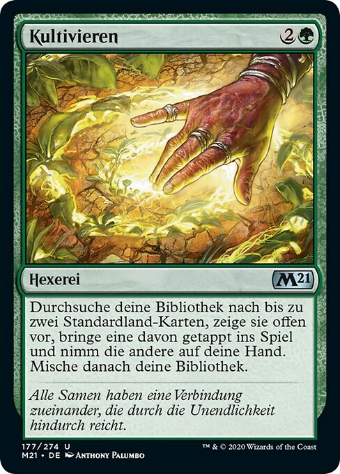 |  Variations : 1Parts— | CultivateSearch your library for up to two basic land cards, reveal those cards, put one onto the battlefield tapped and the other into your hand, then shuffle.