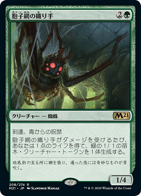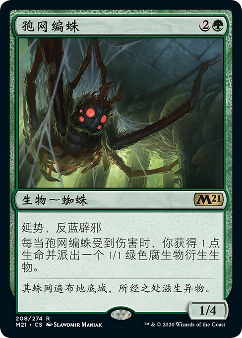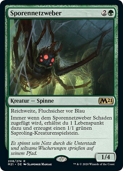 ![]() Variations : 1Parts : 2 | Sporeweb Weaver1 / 4 Reach, hexproof from blue Whenever this creature is dealt damage, you gain 1 life and create a 1/1 green Saproling creature token.