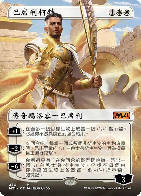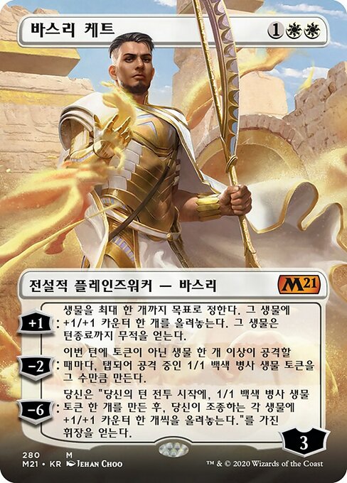 ![]() Variations : 2Parts : 3 | Basri Ket+1 : Put a +1/+1 counter on up to one target creature. It gains indestructible until end of turn. −2 : Whenever one or more nontoken creatures attack this turn, create that many 1/1 white Soldier creature tokens that are tapped and attacking. −6 : You get an emblem with "At the beginning of combat on your turn, create a 1/1 white Soldier creature token, then put a +1/+1 counter on each creature you control."