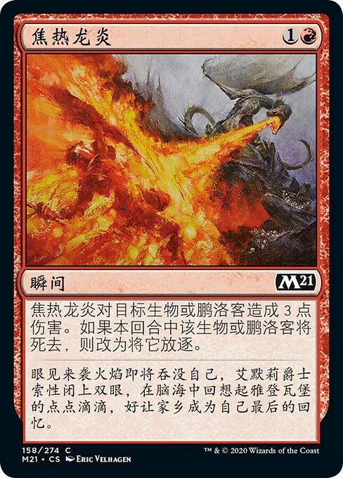 ![]() Variations— Parts— | 焦熱龍炎焦熱龍炎對目標生物或鵬洛客造成3點傷害。如果本回合中該生物或鵬洛客將死去,則改為將它放逐。