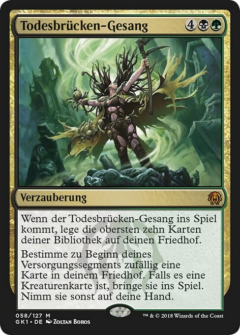 |  Variations— Parts— | Todesbrücken-GesangWenn der Todesbrücken-Gesang ins Spiel kommt, millst du zehn Karten. Zu Beginn deines Versorgungssegments bestimmst du per Zufall eine Karte in deinem Friedhof. Falls es eine Kreaturenkarte ist, bringe sie ins Spiel zurück. Bringe sie sonst auf deine Hand zurück.