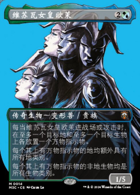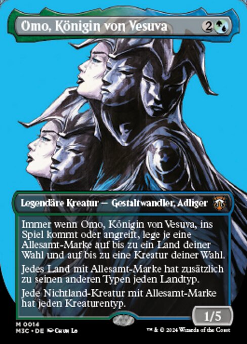 |  Variations : 6Parts— | Omo, Queen of Vesuva1 / 5 Whenever Omo enters or attacks, put an everything counter on each of up to one target land and up to one target creature. Each land with an everything counter on it is every land type in addition to its other types. Each nonland creature with an everything counter on it is every creature type.