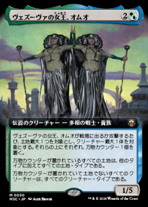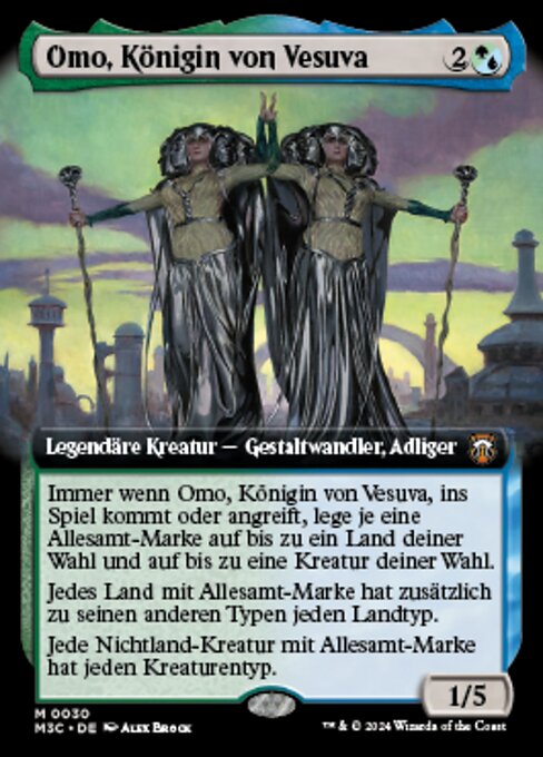 |  Variations : 6Parts— | Omo, Queen of Vesuva1 / 5 Whenever Omo enters or attacks, put an everything counter on each of up to one target land and up to one target creature. Each land with an everything counter on it is every land type in addition to its other types. Each nonland creature with an everything counter on it is every creature type.