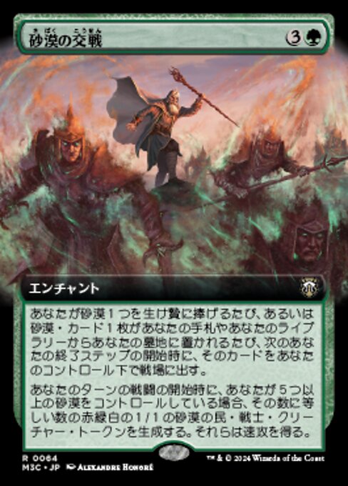 ![]() Variations : 1Parts : 2 | Desert WarfareWhenever you sacrifice a Desert and whenever a Desert card is put into your graveyard from your hand or library, put that card onto the battlefield under your control at the beginning of your next end step. At the beginning of combat on your turn, if you control five or more Deserts, create that many 1/1 red, green, and white Sand Warrior creature tokens. They gain haste.
