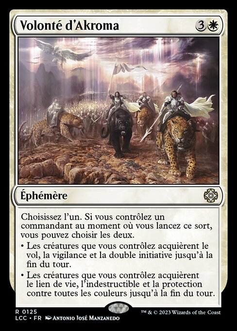 |  Variations— Parts— | Volonté d'AkromaChoisissez l'un. Si vous contrôlez un commandant au moment où vous lancez ce sort, vous pouvez choisir les deux à la place. • Les créatures que vous contrôlez acquièrent le vol, la vigilance et la double initiative jusqu'à la fin du tour. • Les créatures que vous contrôlez acquièrent le lien de vie, l'indestructible et la protection contre chaque couleur jusqu'à la fin du tour.