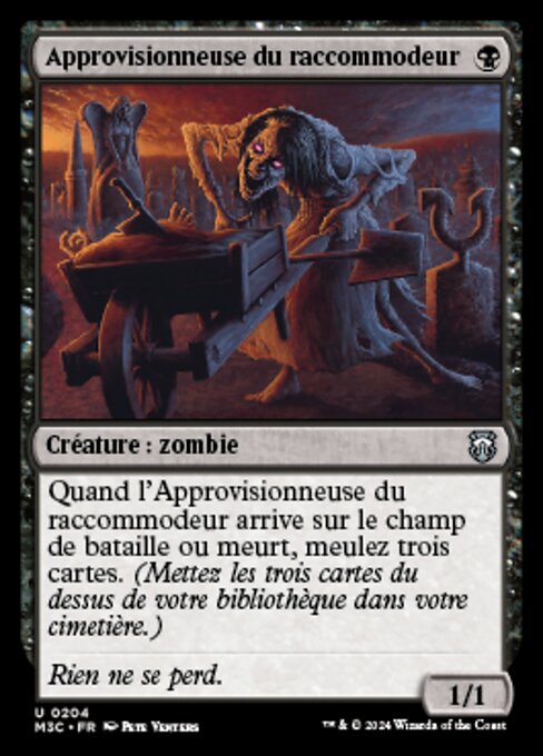 |  Variations— Parts— | Approvisionneuse du raccommodeur1 / 1 Quand l'Approvisionneuse du raccommodeur arrive sur le champ de bataille ou meurt, meulez trois cartes. (Mettez les trois cartes du dessus de votre bibliothèque dans votre cimetière.)