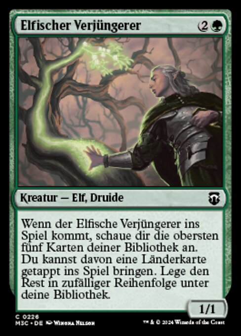 |  Variations— Parts— | Rajeunisseur elfe1 / 1 Quand le Rajeunisseur elfe arrive sur le champ de bataille, regardez les cinq cartes du dessus de votre bibliothèque. Vous pouvez mettre sur le champ de bataille, engagée, une carte de terrain parmi elles. Mettez le reste au-dessous de votre bibliothèque dans un ordre aléatoire.