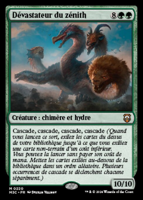 |  Variations— Parts— | 頂点壊滅獣10 / 10 続唱、続唱、続唱、続唱(あなたがこの呪文を唱えたとき、コストがこれより低く土地でないカードが追放されるまで、あなたのライブラリーの一番上から1枚ずつ追放していく。それをマナ・コストを支払うことなく唱えてもよい。それらの追放したカードを、無作為の順番で一番下に置く。複数の続唱はそれぞれに誘発する。)