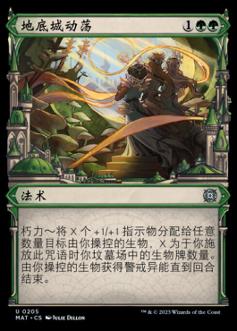 |  Variations : 3Parts— | Undercity UpheavalUndergrowth — Distribute X +1/+1 counters among any number of target creatures you control, where X is the number of creature cards in your graveyard as you cast this spell. Creatures you control gain vigilance until end of turn.