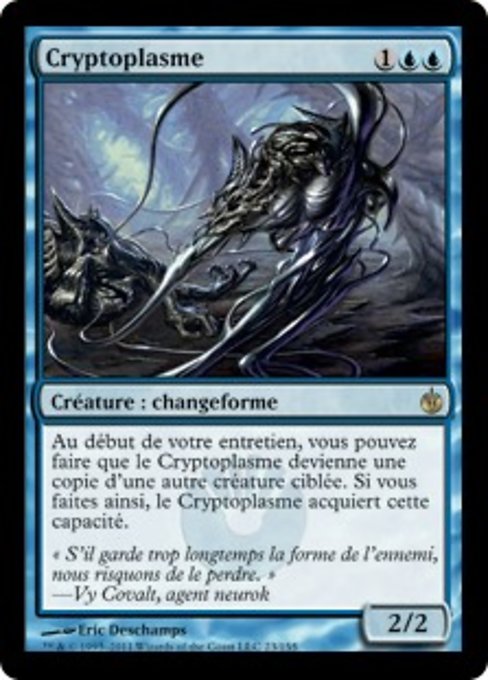LegalitiesLegal Duel Penny Predh Legacy Modern Vintage Commander Oathbreaker Not Legal Brawl Future Pauper Alchemy Pioneer Historic Standard Timeless Gladiator Oldschool Premodern Standardbrawl Paupercommander RulingsIf another creature becomes a copy of Cryptoplasm, it will become a copy of whatever Cryptoplasm is currently copying (if anything), plus it will have Cryptoplasm’s triggered ability.