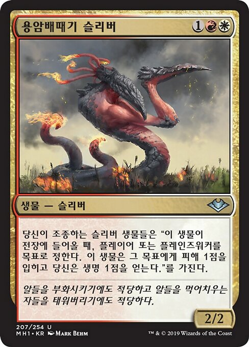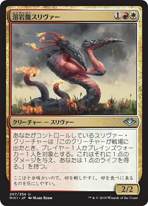 ![]() Variations— Parts— | Lavabelly Sliver2 / 2 Sliver creatures you control have "When this creature enters, it deals 1 damage to target player or planeswalker and you gain 1 life."