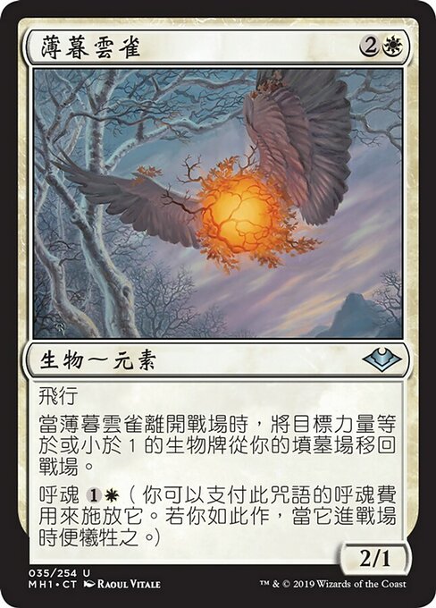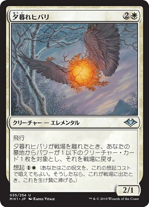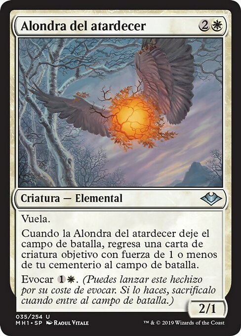 ![]() Variations— Parts— | Vesperlark2 / 1 Flying When this creature leaves the battlefield, return target creature card with power 1 or less from your graveyard to the battlefield. Evoke