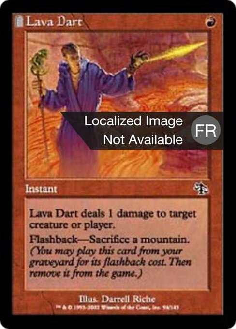 |  Variations— Parts— | Dard de laveLe Dard de lave inflige 1 blessure à n'importe quelle cible. Flashback — Sacrifiez une montagne. (Vous pouvez lancer cette carte depuis votre cimetière pour son coût de flashback. Exilez-la ensuite.)