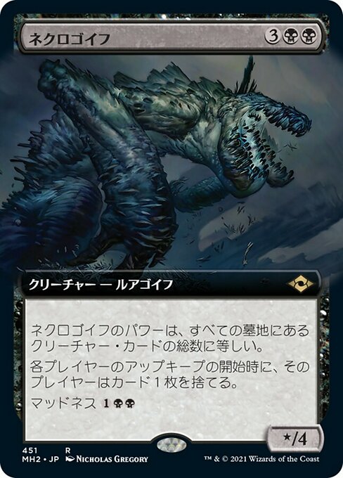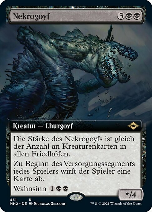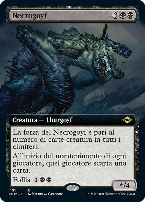 |  Variations : 2Parts— | Necrogoyf* / 4 Necrogoyf's power is equal to the number of creature cards in all graveyards. At the beginning of each player's upkeep, that player discards a card. Madness