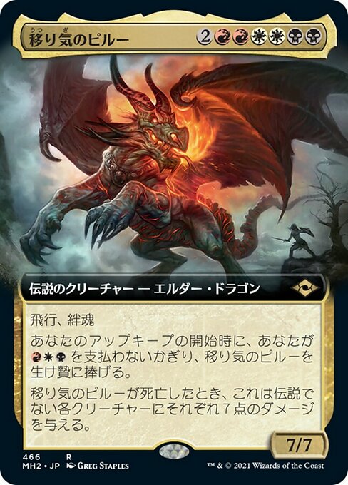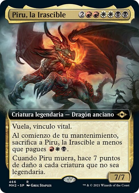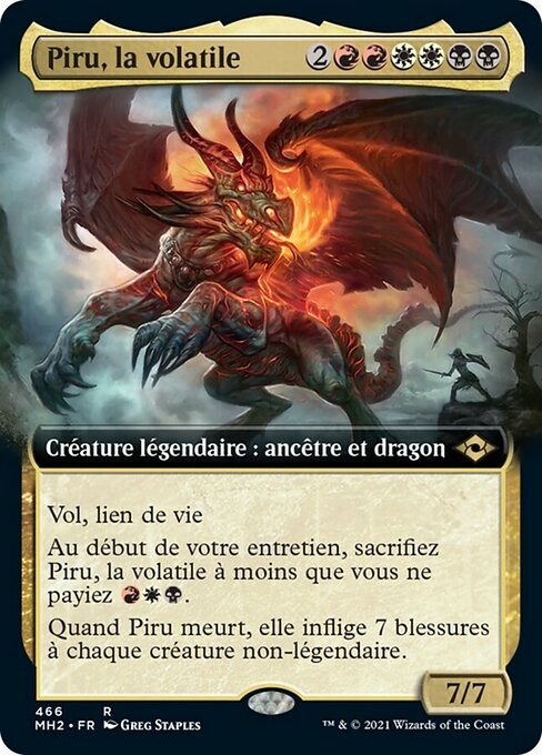 |  Variations : 2Parts— | Piru, the Volatile7 / 7 Flying, lifelink At the beginning of your upkeep, sacrifice Piru unless you pay When Piru dies, it deals 7 damage to each nonlegendary creature.