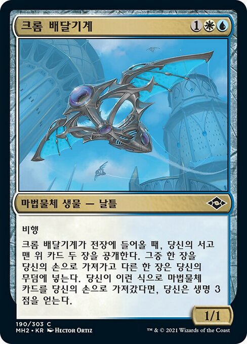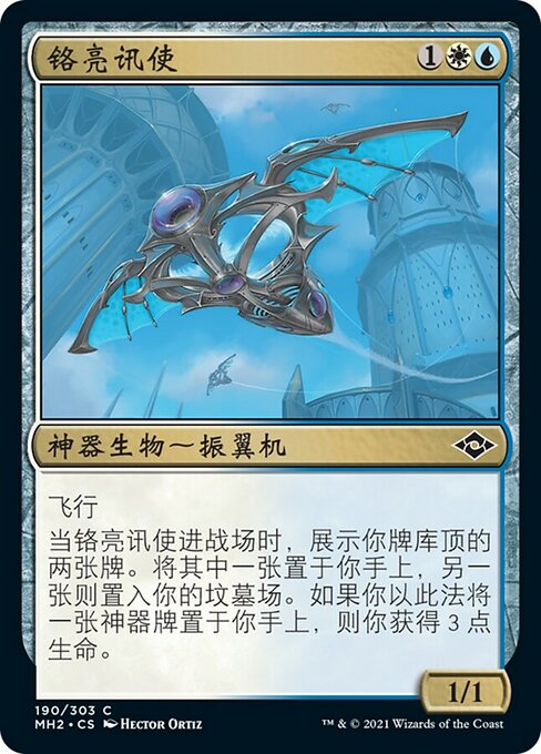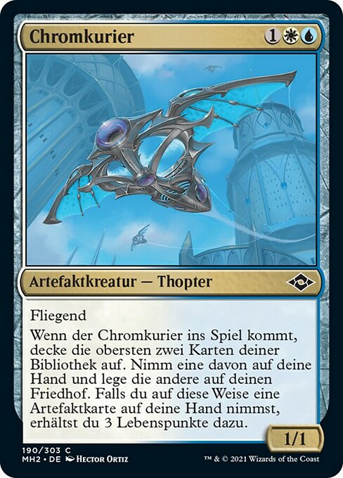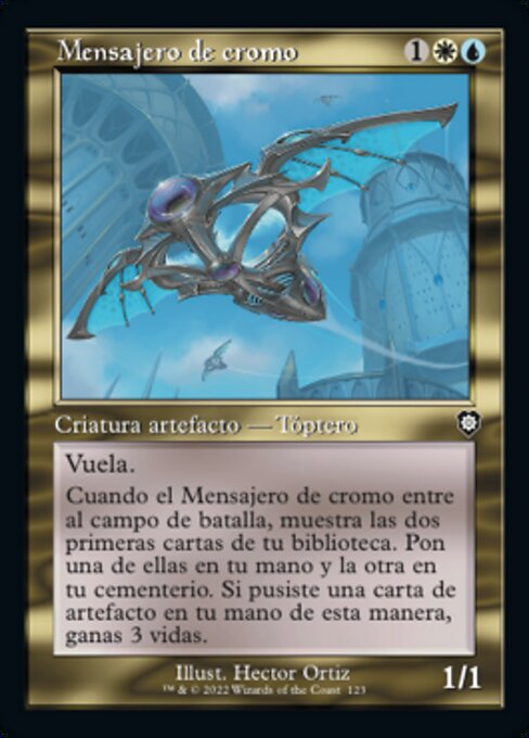 |  Variations— Parts— | Mensajero de cromo1 / 1 Vuela. Cuando el Mensajero de cromo entre al campo de batalla, muestra las dos primeras cartas de tu biblioteca. Pon una de ellas en tu mano y la otra en tu cementerio. Si pusiste una carta de artefacto en tu mano de esta manera, ganas 3 vidas.