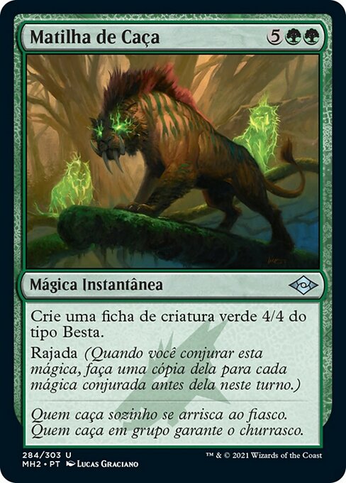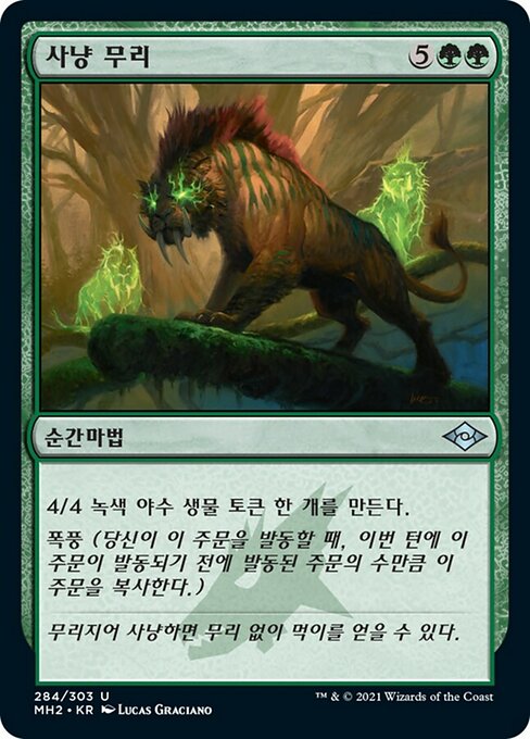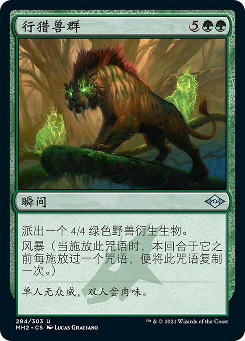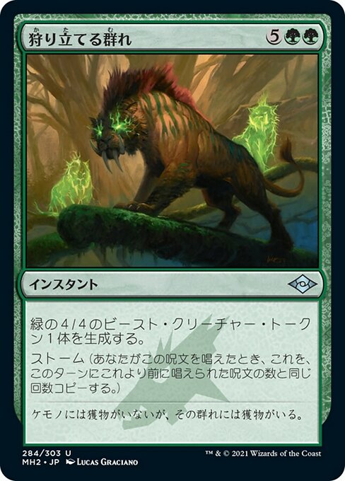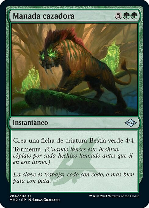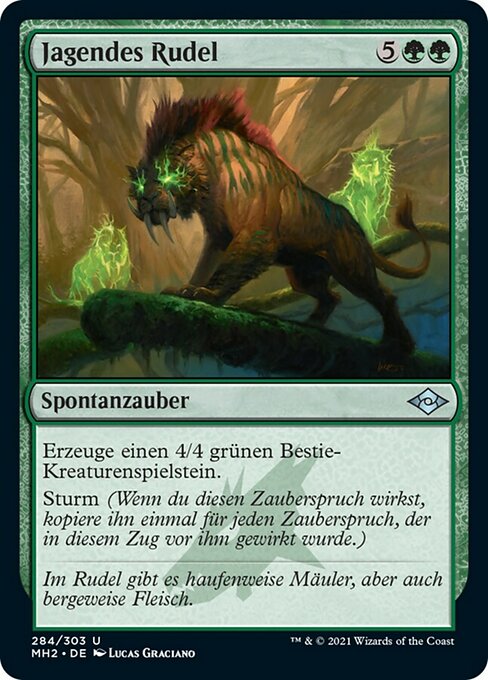 |  Variations— Parts— | Охотничья СтаяСоздайте одну фишку существа 4/4 зеленый Зверь. Шторм (Когда вы разыгрываете это заклинание, скопируйте его за каждое заклинание, разыгранное в этом ходу до него.)