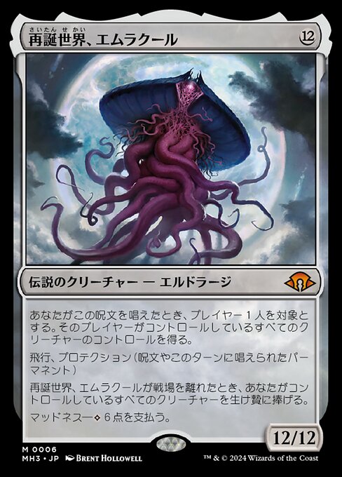 |  Variations : 4Parts— | Emrakul, the World Anew12 / 12 When you cast this spell, gain control of all creatures target player controls. Flying, protection from spells and from permanents that were cast this turn When Emrakul leaves the battlefield, sacrifice all creatures you control. Madness—Pay six