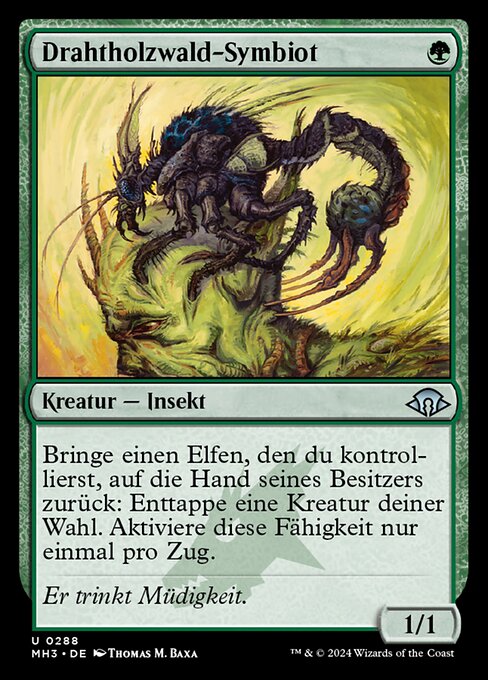 ![]() Variations— Parts— | Simbiota de Wirewood1 / 1 Devolva um Elfo que você controla para a mão de seu dono: Desvire a criatura alvo. Ative apenas uma vez a cada turno.