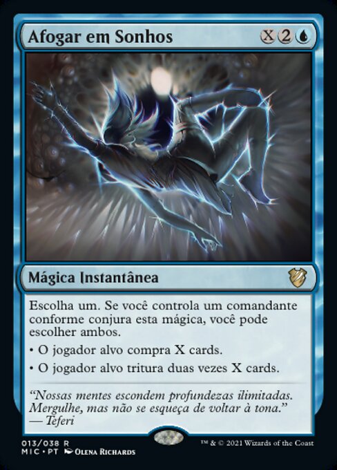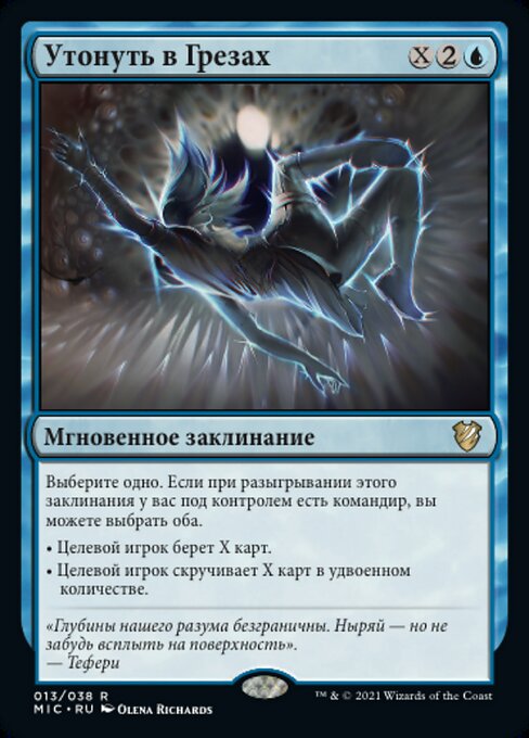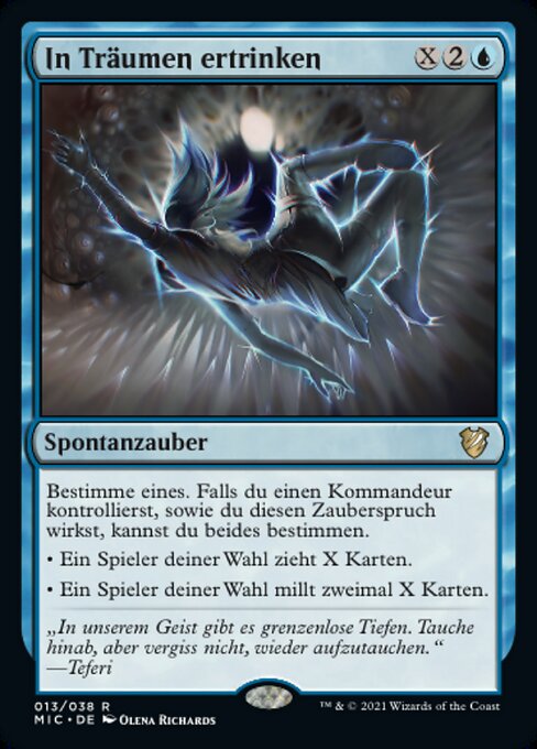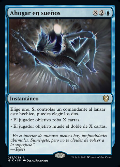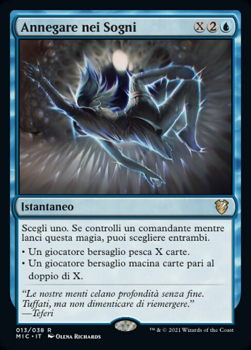 ![]() Variations : 1Parts— | Drown in DreamsChoose one. If you control a commander as you cast this spell, you may choose both instead. • Target player draws X cards. • Target player mills twice X cards.
