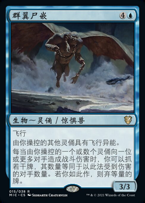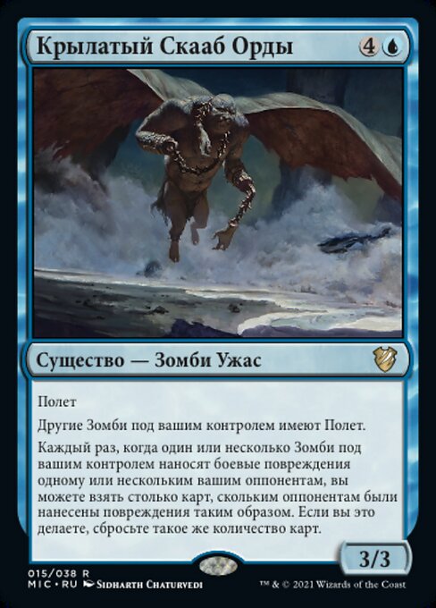 |  Variations : 1Parts— | Hordewing Skaab3 / 3 Flying Other Zombies you control have flying. Whenever one or more Zombies you control deal combat damage to one or more of your opponents, you may draw cards equal to the number of opponents dealt damage this way. If you do, discard that many cards.