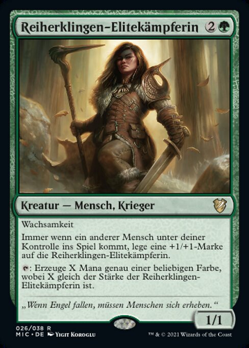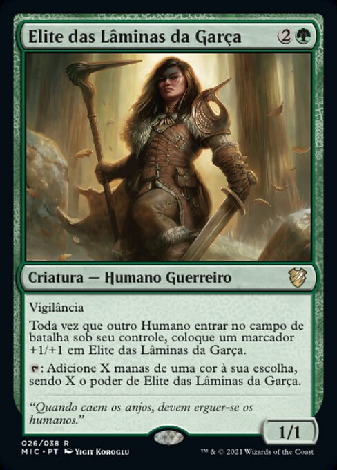![]() Variations : 1Parts— | Heronblade Elite1 / 1 Vigilance Whenever another Human you control enters, put a +1/+1 counter on this creature.