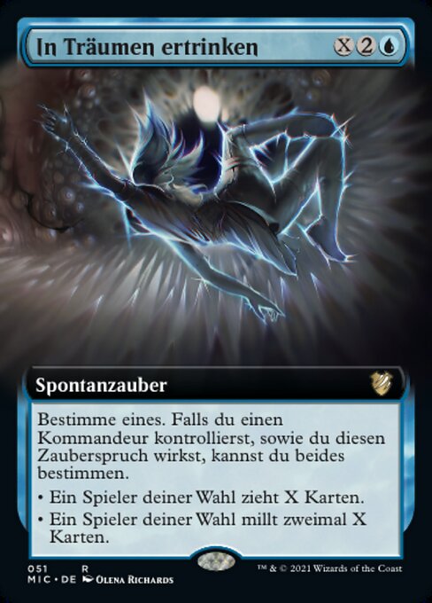 ![]() Variations : 1Parts— | Drown in DreamsChoose one. If you control a commander as you cast this spell, you may choose both instead. • Target player draws X cards. • Target player mills twice X cards.