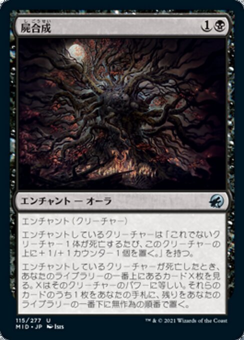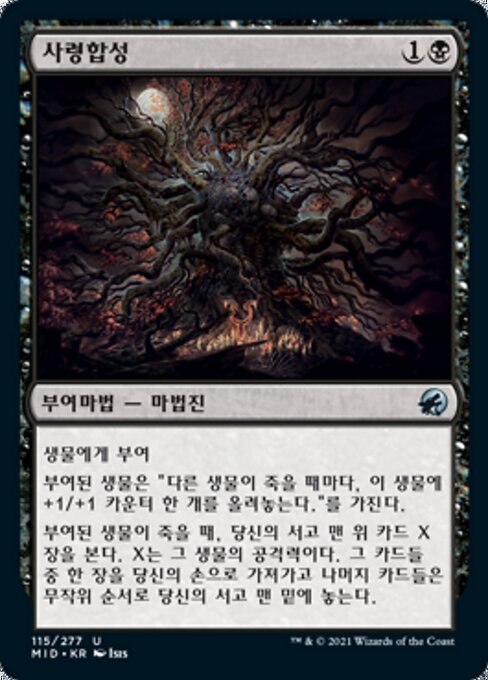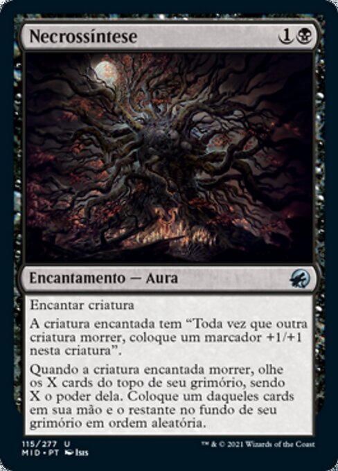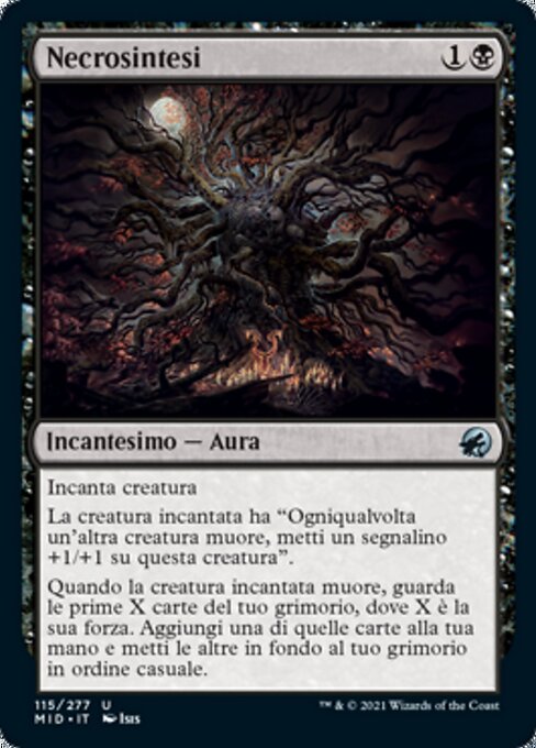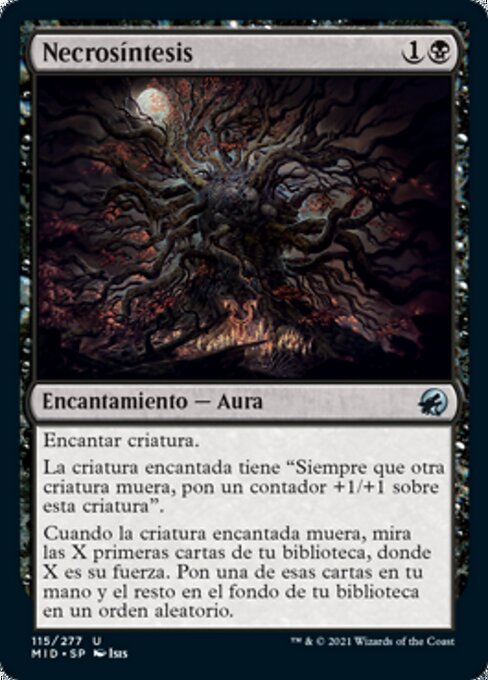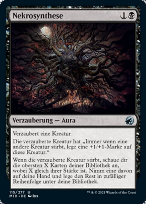 ![]() Variations— Parts— | NecrosynthesisEnchant creature Enchanted creature has "Whenever another creature dies, put a +1/+1 counter on this creature." When enchanted creature dies, look at the top X cards of your library, where X is its power. Put one of those cards into your hand and the rest on the bottom of your library in a random order.