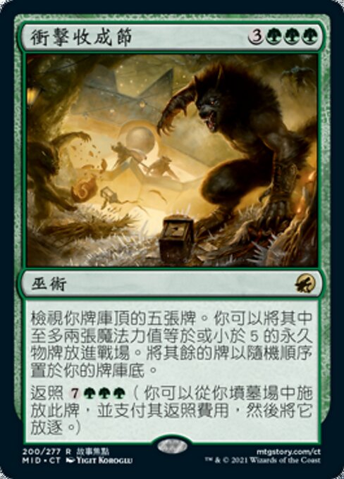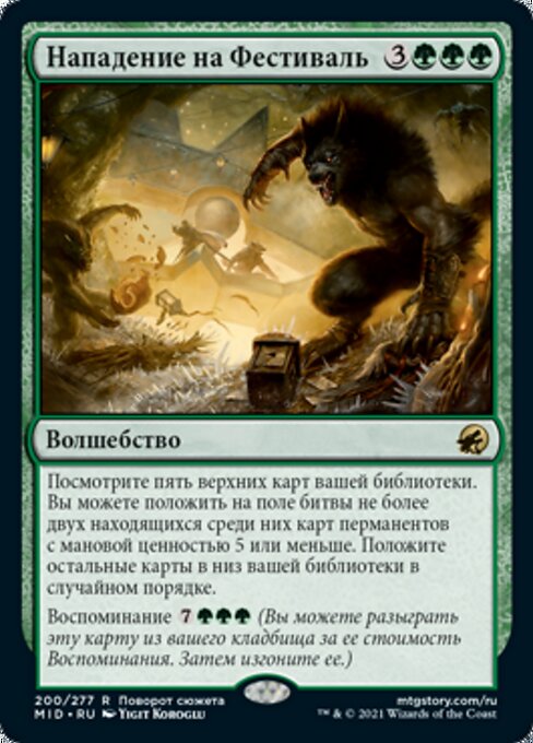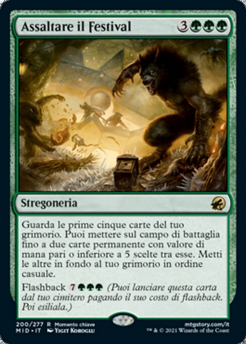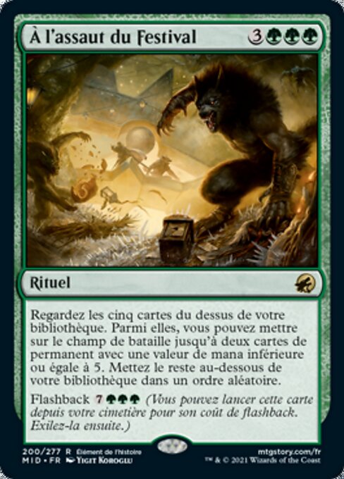 |  Variations : 1Parts— | Storm the FestivalLook at the top five cards of your library. You may put up to two permanent cards with mana value 5 or less from among them onto the battlefield. Put the rest on the bottom of your library in a random order. Flashback