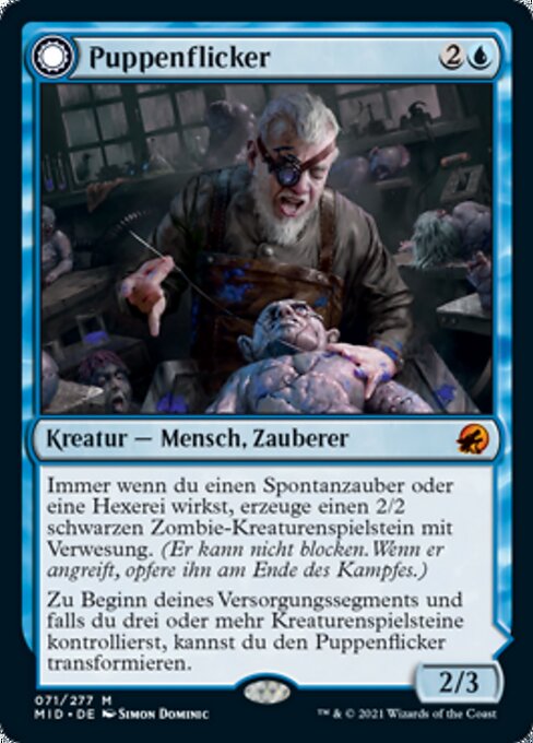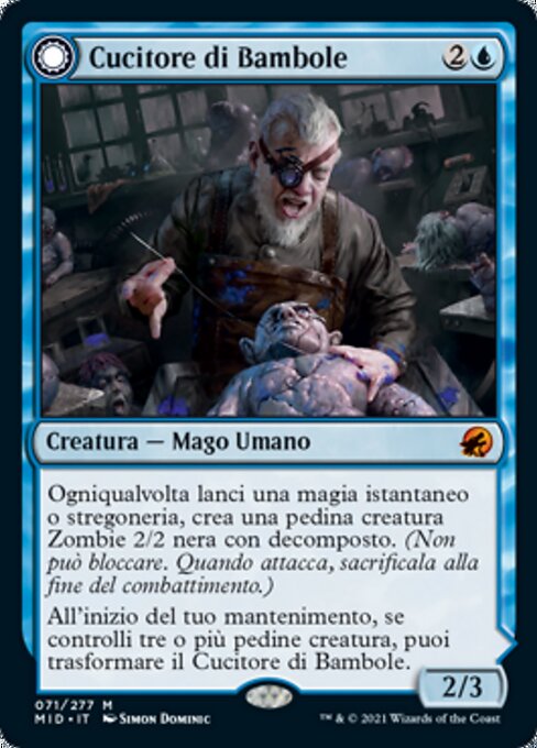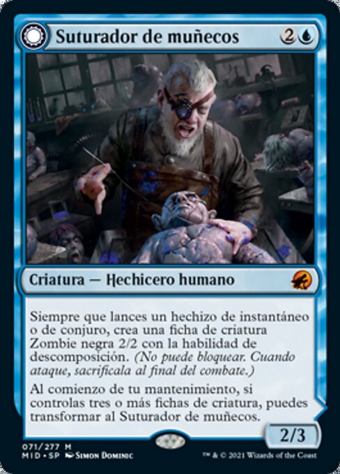 |  Variations : 1Parts : 2 | Poppet Stitcher2 / 3 Whenever you cast an instant or sorcery spell, create a 2/2 black Zombie creature token with decayed. (It can't block. When it attacks, sacrifice it at end of combat.) At the beginning of your upkeep, if you control three or more creature tokens, you may transform this creature.