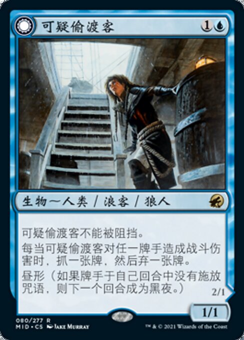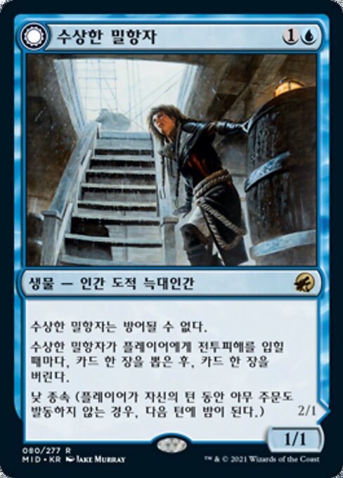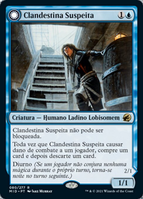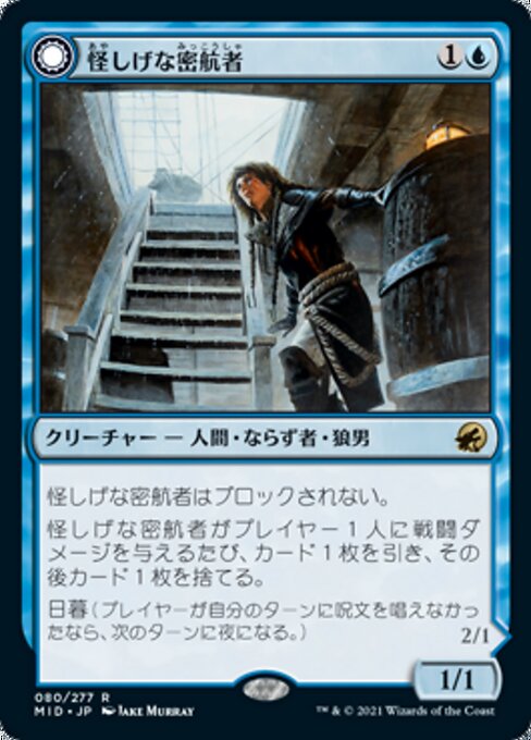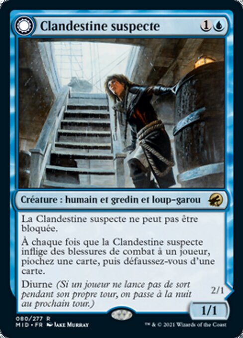 |  Variations : 1Parts : 2 | Suspicious Stowaway1 / 1 This creature can't be blocked. Whenever this creature deals combat damage to a player, draw a card, then discard a card. Daybound (If a player casts no spells during their own turn, it becomes night next turn.)