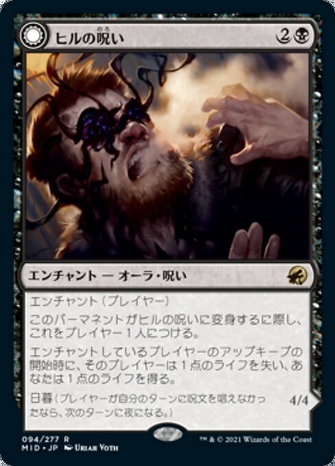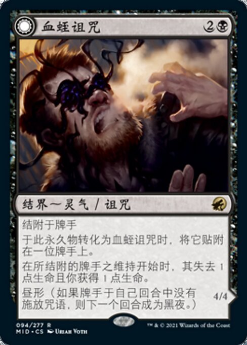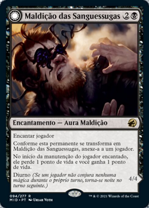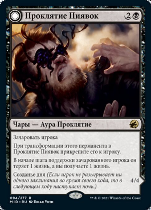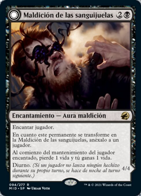 |  Variations : 1Parts : 2 | Curse of LeechesEnchant player As this permanent transforms into Curse of Leeches, attach it to a player. At the beginning of enchanted player's upkeep, they lose 1 life and you gain 1 life. Daybound (If a player casts no spells during their own turn, it becomes night next turn.)