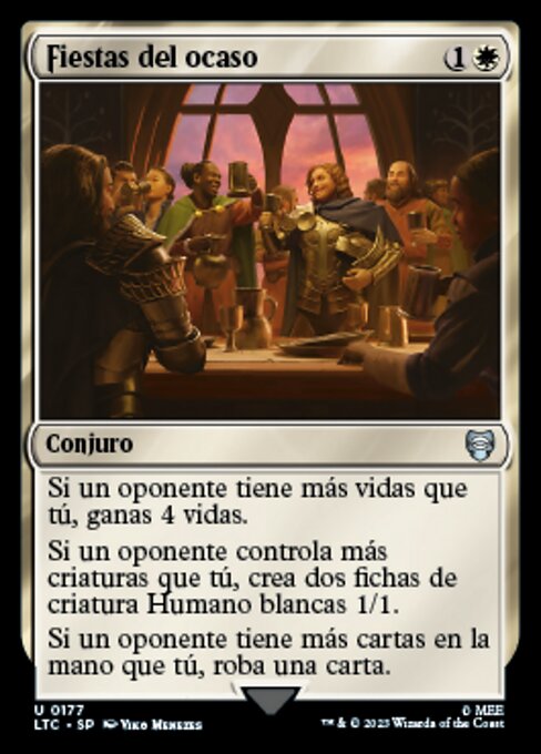 ![]() Variations— Parts— | Fiestas del ocasoSi un oponente tiene más vidas que tú, ganas 4 vidas. Si un oponente controla más criaturas que tú, crea dos fichas de criatura Humano blancas 1/1. Si un oponente tiene más cartas en la mano que tú, roba una carta.