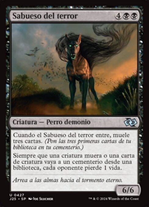 |  Variations— Parts— | Sabueso del terror6 / 6 Cuando el Sabueso del terror entre al campo de batalla, muele tres cartas. (Pon las tres primeras cartas de tu biblioteca en tu cementerio.) Siempre que una criatura muera o una carta de criatura vaya a un cementerio desde una biblioteca, cada oponente pierde 1 vida.