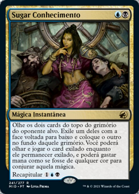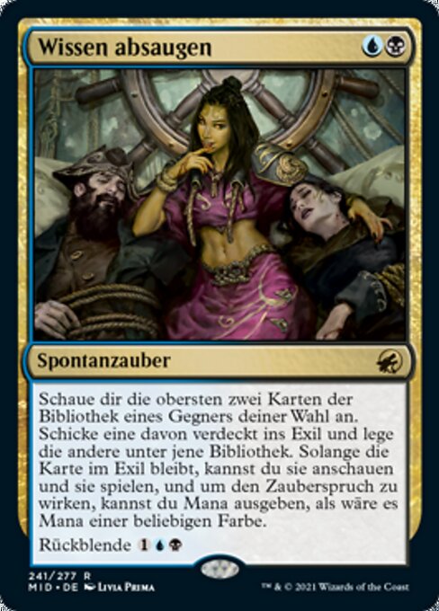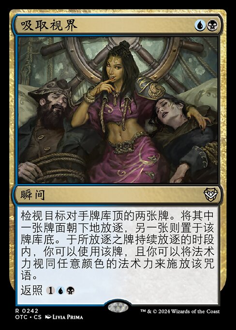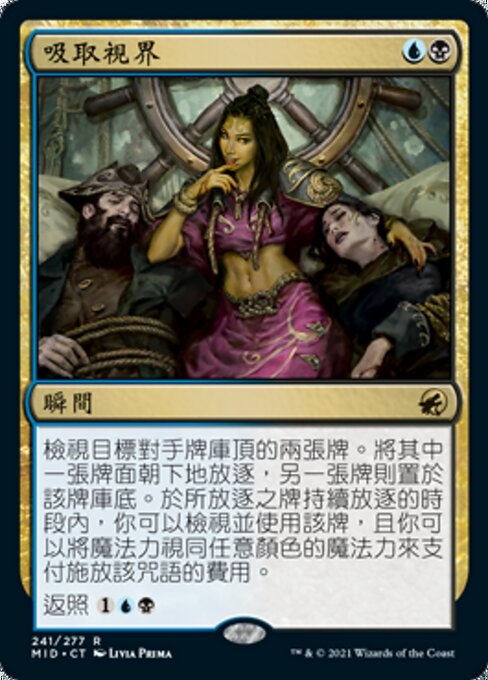 |  Variations— Parts— | 吸取视界检视目标对手牌库顶的两张牌。将其中一张牌面朝下地放逐,另一张牌则置于该牌库底。于所放逐之牌持续放逐的时段内,你可以检视并使用该牌,且你可以将法术力视同任意颜色的法术力来支付施放该咒语的费用。 返照