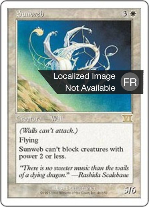 ![]() Variations— Parts— | Toile solaire5 / 6 Defender (This creature can't attack.) Flying This creature can't block creatures with power 2 or less.